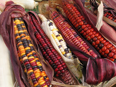 Last winter I blathered on about my garden nemesis, corn, in The Promise Of Blue Jade Corn. Well..."Yo Adrian, I DID IT!" Both my Painted Mountain and little Blue Jade corn not only grew up without falling over but actually provided us with numerous cobs of brilliant multicolored corn. Slightly mealy heirloom corn that we really do enjoy the flavor of and should make for an excellent corn meal.