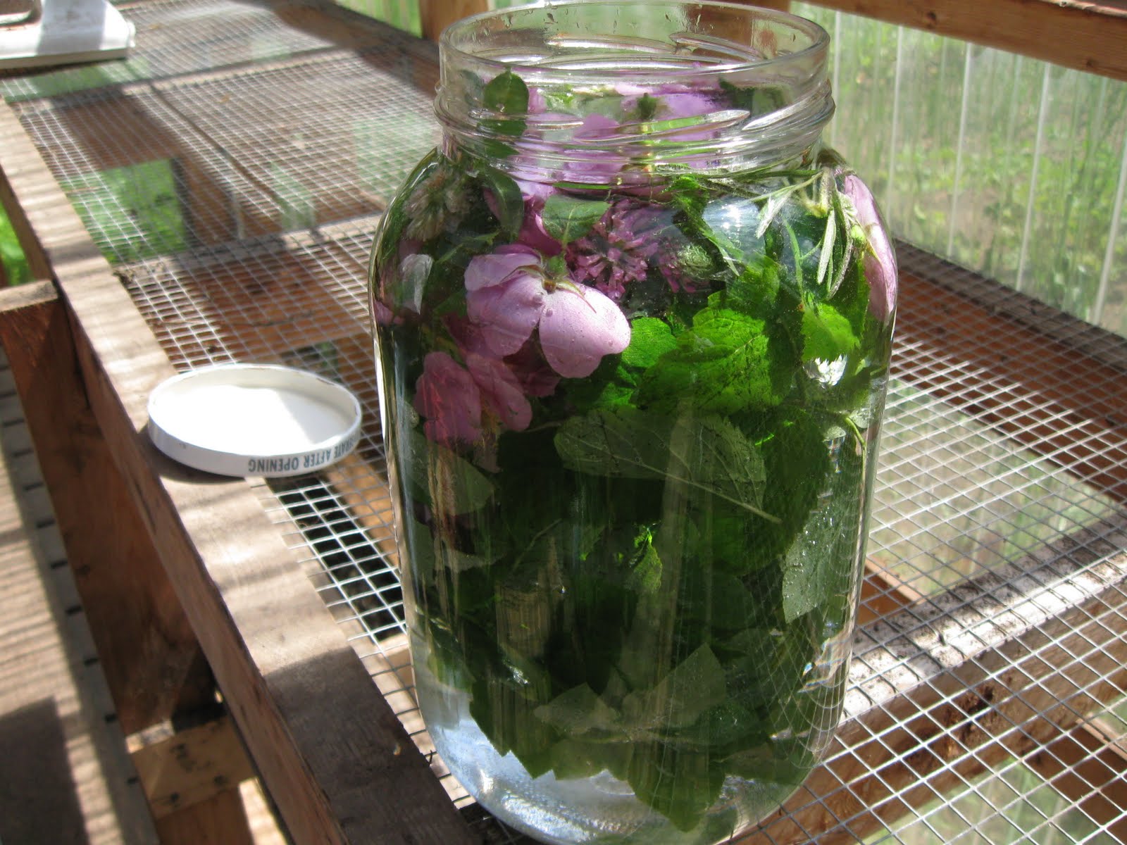 A light and refreshing sun tea in the works comprised of clover, huckleberry leaves, rose petals, mint, and lemon balm.