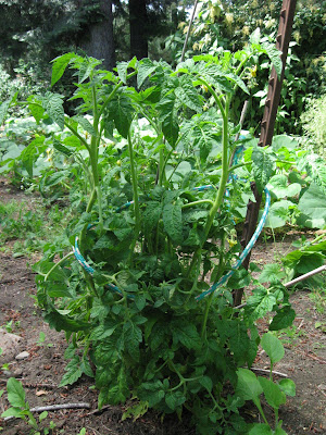 While the vast majority of our tomato and pepper plants are planted in the ground every extra spot of space is filled with potted peppers and tomatoes...lots and lots of them. I figured that the peppers in black pots would outperform the ones in the ground this year and I am right so far. Potting a bunch of our plants will also allow me to usher them into the greenhouse if September's weather does not pan out. This is what I enjoy the most about gardening, the challenge of making it happen no matter what. A few of the smaller dwarf tomato varieties are even starting to bear fruit.