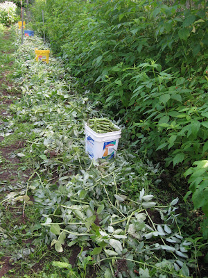 We harvested a few rows of fava beans and are quite happy with how well they filled out this season. For the most part we use these as dried beans in soups, bean dishes, and their subtle flavor makes them great for re-fried beans. After shelling they are placed on racks in the sun to dry, once dried they are stored away in glass gallon jars until needed. Of course a bucket of the nicest looking pods are always shelled separately for next year's seed. Because of their extremely cold hardy nature they are our absolute favorite bean to grow and the remaining debris are an excellent amendment for the soil in our gardens.