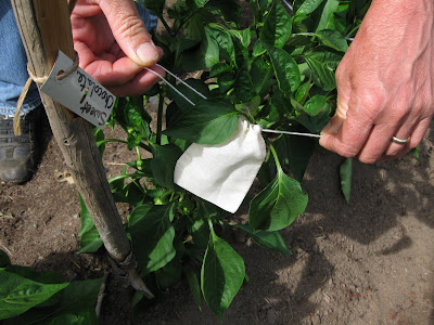 My wife, bagging a Sweet Chocolate pepper flower with a muslin sack to avoid cross pollination as we grow all of our varieties so close to each other.